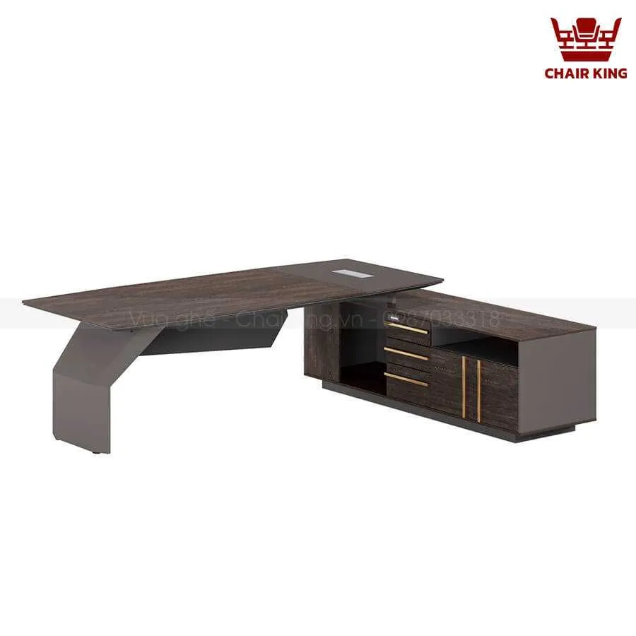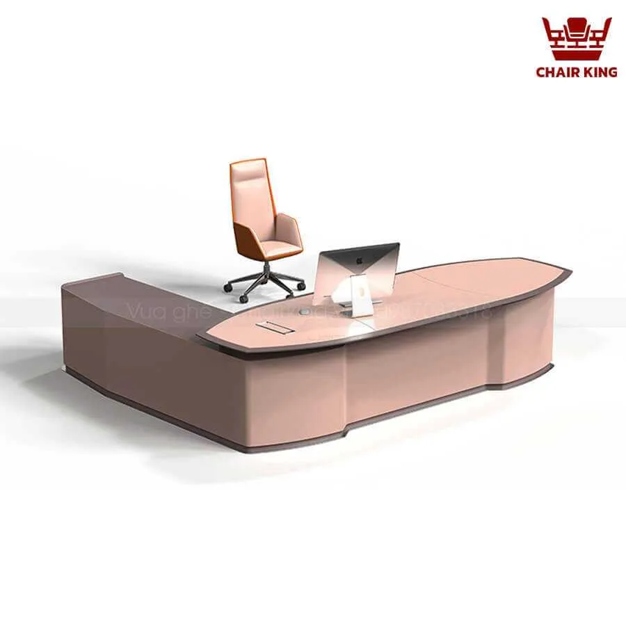 Bàn chủ tịch với phong cách thiết kế mạnh mẽ, đẳng cấp mang đến một sự thư thái khi sử dụng. Thiết kế chữ L tối ưu hóa không gian. Đường vân sắc nét, phần góc được bo tròn giúp cho bàn trở nên mềm mại hơn. Đặc biệt hơn cả chính là hiệu ứng liên kết từ chân bàn này sang chân bàn kia tạo sự phá cách cho sản phẩm. Phần chân trụ cứng cáp đảm bảo an toàn khi sử dụng.