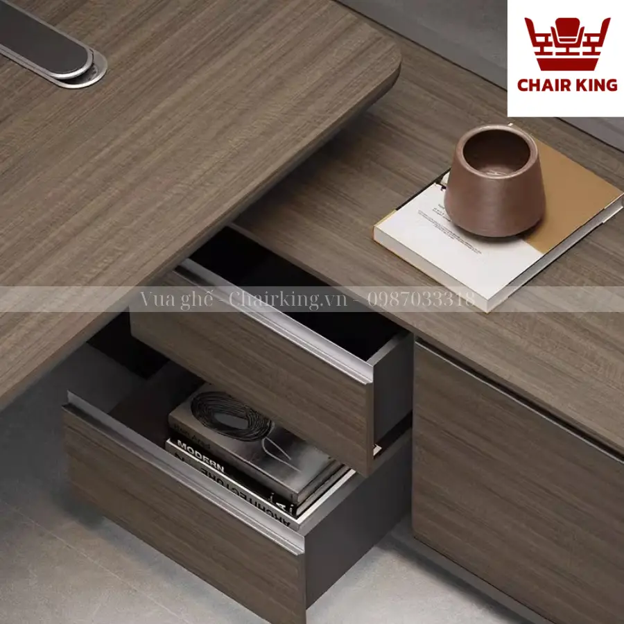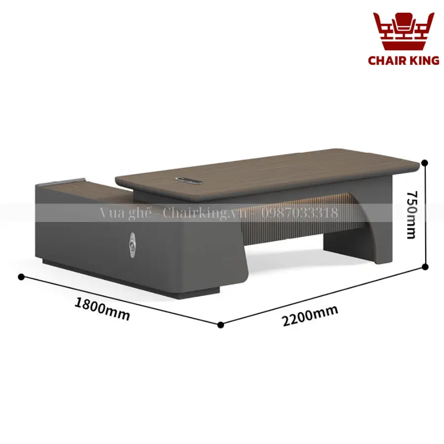 Bàn Chủ Tịch Chairking sở hữu thiết kế đẳng cấp, hiện đại với đường nét mạnh mẽ và tinh tế. Kiểu dáng bề thế với kích thước rộng rãi giúp chủ tịch thư thái làm việc, đồng thời tạo cảm giác vững chãi, chắc chắn. Màu sắc trầm đẳng cấp thích hợp với các không gian văn phòng khác nhau, từ hiện đại đến cổ điển. Các chi tiết được gia công tỉ mỉ, tạo nên tổng thể hài hòa, cân đối, góp phần nâng tầm đẳng cấp văn phòng.