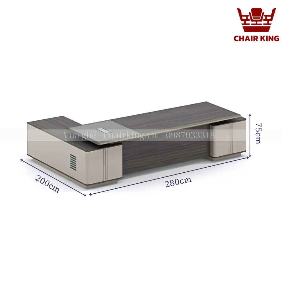 Bàn chủ tịch Chairking BCTC-B910 sở hữu thiết kế hiện đại với đường nét tinh tế, mạnh mẽ từ Vua ghế Chairking. Màu sắc trang nhã kết hợp với các chi tiết kim loại mạ bóng tạo nên vẻ ngoài sang trọng, thích hợp với không gian văn phòng lãnh đạo. Kích thước bàn rộng rãi, tạo môi trường làm việc thoải mái và tiện nghi.