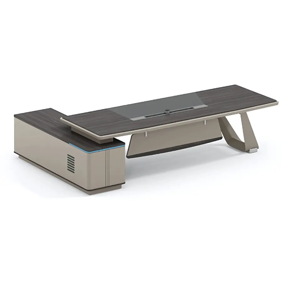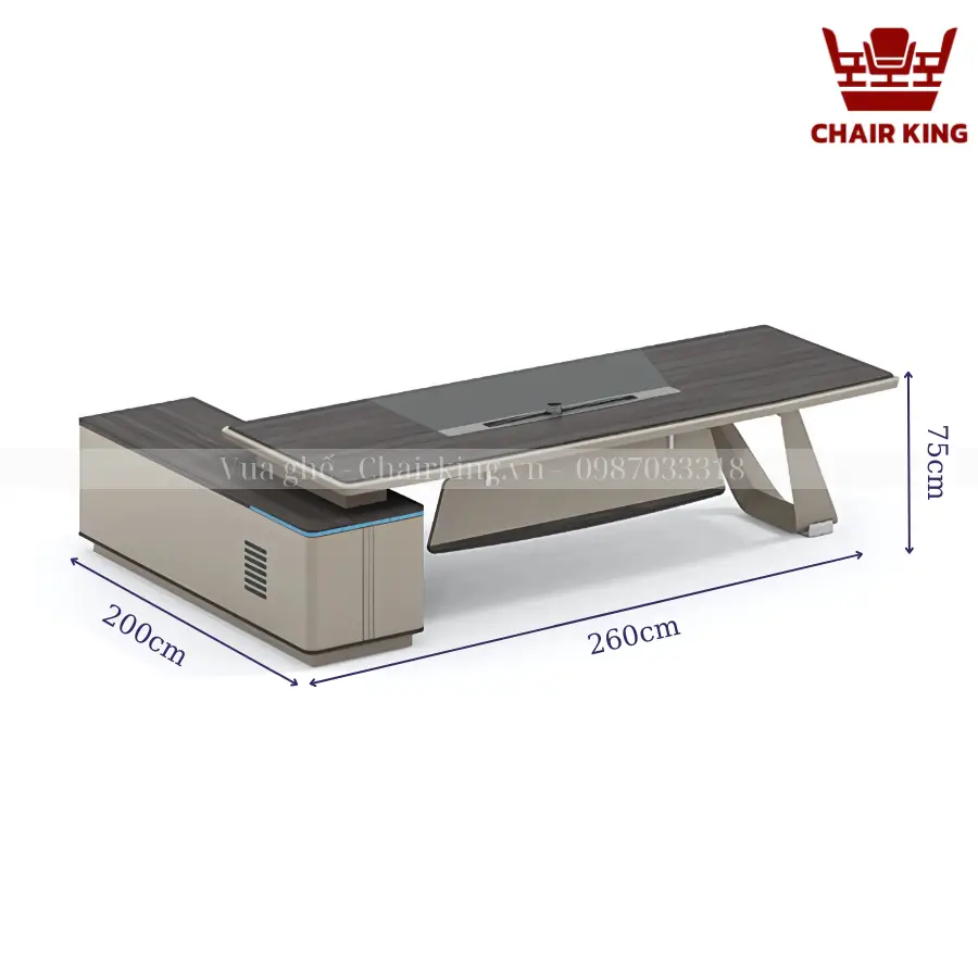 Không chạy theo những thiết kế cầu kỳ hay rối mắt, bàn chủ tịch Chairking chọn cho mình lối kiến tạo tinh giản nhưng mạnh mẽ, thể hiện rõ sự tự tin và bản lĩnh trong từng đường nét. Mặt bàn phẳng rộng được thiết kế vuông vức, kết hợp cùng phần yếm bàn cách điệu vừa giữ được sự kín đáo cần thiết, vừa tạo điểm nhấn thẩm mỹ hiện đại. Phần chân bàn được xử lý chắc chắn với chất liệu gỗ cao cấp và các chi tiết kim loại nhấn nhá, mang đến tổng thể vững chãi, cân đối, sang trọng nhưng không nặng nề.