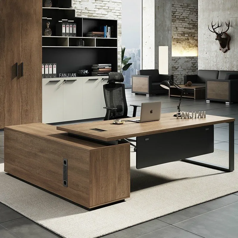Bàn giám đốc thiết kế chữ L có kèm tủ phụ với nhiều ngăn đựng đồ rộng rãi. Mặt bàn hình chữ nhật kích thước lớn giúp người ngồi thoải mái nhất. Viền bao mặt bàn bằng PVC, chống trầy xước, bền đẹp và tăng tính thẩm mỹ. Cạnh bàn được cắt gọt kỹ càng, gia công tỉ mỉ tăng tính thẩm mỹ cho sản phẩm. Đồng thời đảm bảo an toàn cho người dùng tránh tổn thương khi va chạm.