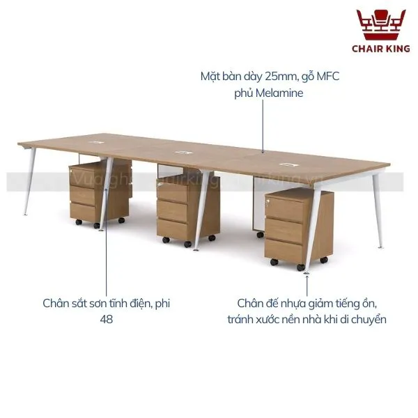 Kiểu dáng hình chữ nhật thanh thoát, mặt bàn rộng phẳng giúp bố trí tài liệu, laptop, máy chiếu và các thiết bị khác một cách khoa học. Phần chân bàn dạng côn mang đến sự chắc chắn, vững chãi, đồng thời tạo nên nét hiện đại và sang trọng cho tổng thể sản phẩm. Từng chi tiết từ chân bàn, giằng bàn đến các phụ kiện đi kèm đều được gia công cẩn thận, giúp sản phẩm không chỉ đẹp mắt mà còn đảm bảo tính ứng dụng cao.
