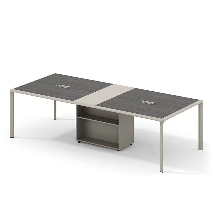 Một trong những ưu điểm nổi bật của Bàn họp Etene H930 chính là thiết kế 4 chân sắt sơn tĩnh điện vô cùng thanh gọn nhưng chắc chắn, giúp bàn luôn vững chãi dù sử dụng trong thời gian dài. Điểm nhấn ấn tượng chính là trụ giữa bàn được biến tấu thông minh như một kệ tài liệu, mang đến sự tiện lợi tối đa cho người dùng. Không nhiều mẫu bàn họp trên thị trường sở hữu chi tiết độc đáo này, khiến Etene H930 trở thành lựa chọn khác biệt. Phong cách hiện đại pha chút tối giản giúp bàn dễ dàng kết hợp với nhiều không gian, từ phòng họp nhỏ đến phòng hội nghị lớn.