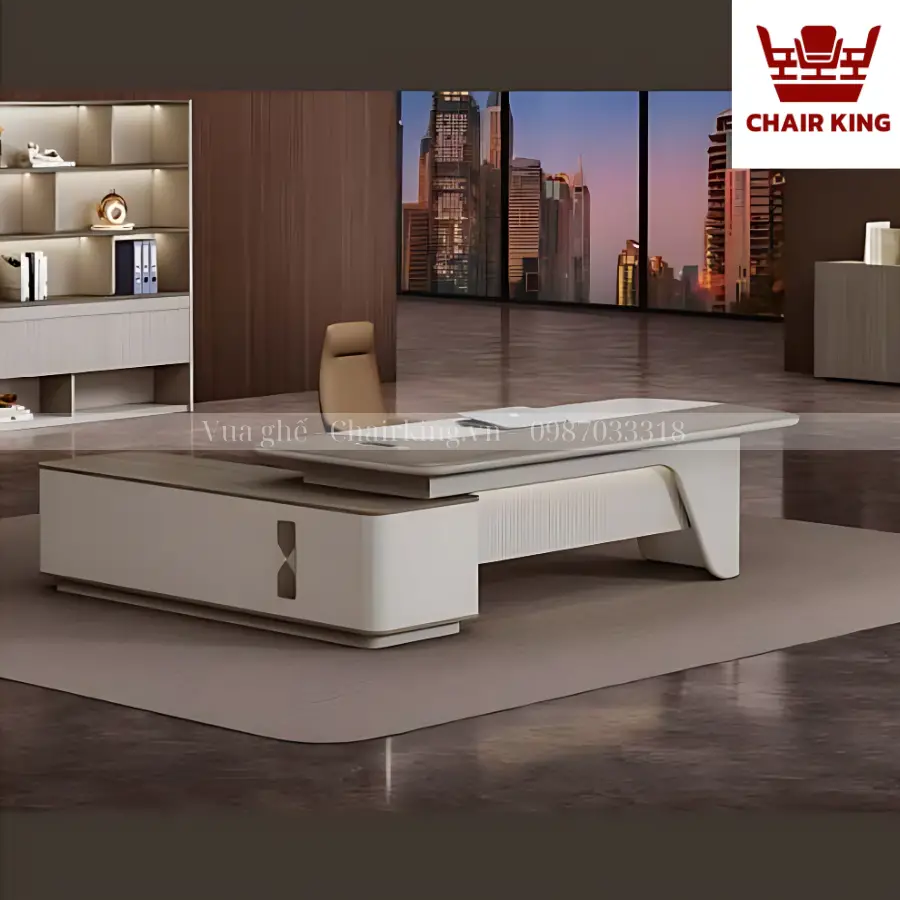 Bàn lãnh đạo Vua ghế Chairking được chế tạo từ ván gỗ sợi phủ melamine đạt tiêu chuẩn E1 Châu Âu, với những ưu điểm như vân gỗ tự nhiên, không mùi, chống ẩm mốc cao, không mối mọt và chịu lực tốt. Bề mặt bàn sử lớp vân gỗ óc chó rõ ràng và tự nhiên, nâng cao tính thẩm mỹ. Viền bao mặt bàn bằng nhựa PVC đúc, bền đẹp, chống va đập. Mặt bàn được thiết kế với nắp điện tiện ích cho người sử dụng. Các phụ kiện hợp kim chất lượng cao đã được xử lý chống rỉ sét, có sự bền bỉ cao. Tủ phụ phân trái/phải có dung tích lớn, chân tủ phụ thiết kế độc đáo, có tích hợp dải đèn led mang đến vẻ đẹp sang trọng, tinh tế.