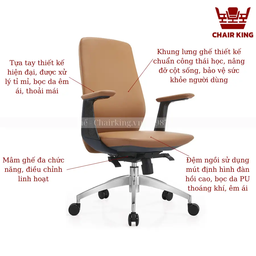 Ghế được bọc lớp mút bọt biển tự nhiên có độ đàn hồi cao, đảm bảo cảm giác êm ái ngay cả khi làm việc trong thời gian dài. Chất liệu da nhân tạo không những đem lại vẻ ngoài tinh tế mà còn dễ dàng vệ sinh, bảo quản. Phần khung xe đa chức năng kết hợp cùng chân ống vuông hợp kim nhôm tạo nên độ vững chắc và chịu lực tuyệt vời. Đặc biệt dễ dàng điều chỉnh góc ngả lưng, phù hợp với các tư thế khác nhau như làm việc tập trung, nghỉ ngơi.