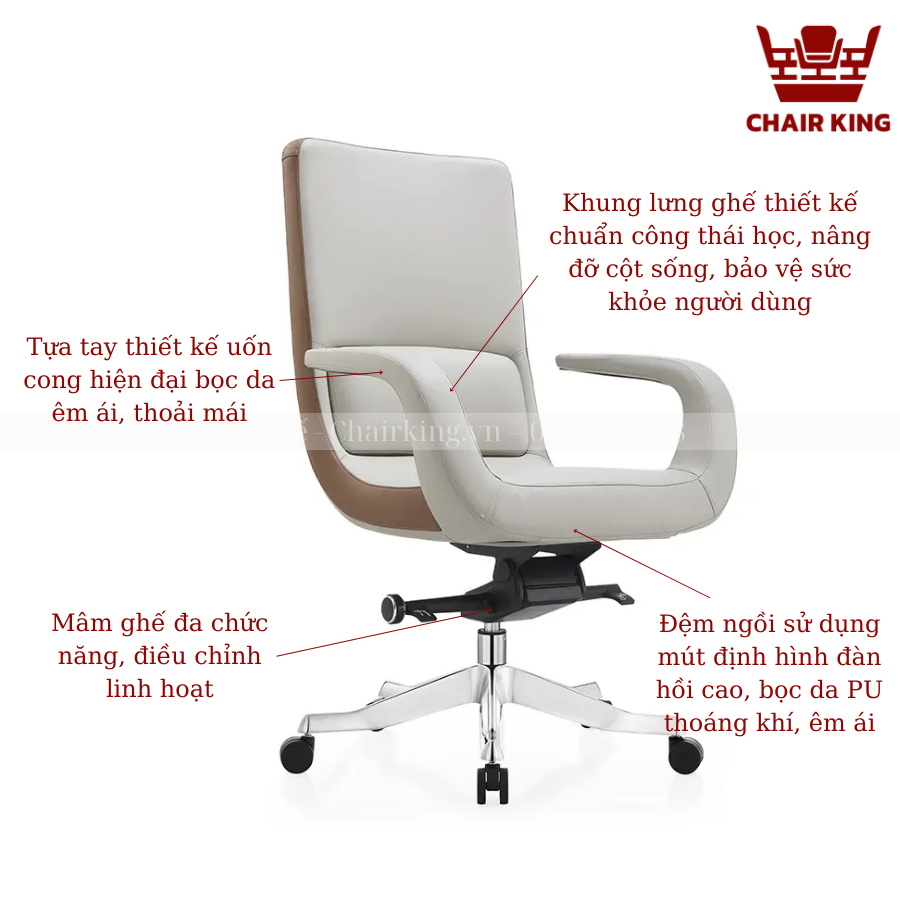 Ghế được bọc lớp mút bọt biển tự nhiên có độ đàn hồi cao, đảm bảo cảm giác êm ái ngay cả khi làm việc trong thời gian dài. Chất liệu da PU cao cấp không những đem lại vẻ ngoài tinh tế mà còn dễ dàng vệ sinh, bảo quản. Phần khung xe đa chức năng kết hợp với chân ống vuông hợp kim nhôm tạo nên độ vững chắc và chịu lực tuyệt vời. Đặc biệt dễ dàng điều chỉnh góc ngả lưng, tương thích với những tư thế khác nhau như làm việc tập trung, nghỉ ngơi.