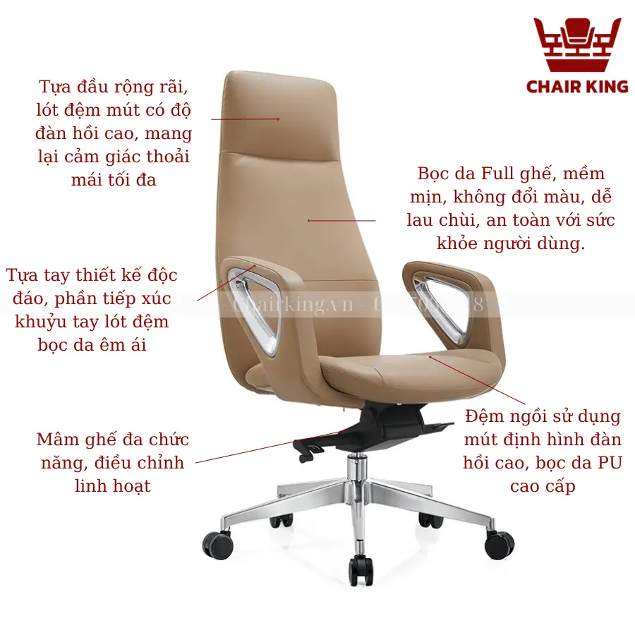 Ghế được bọc lớp mút bọt biển tự nhiên có độ đàn hồi cao, đảm bảo cảm giác êm ái ngay cả khi làm việc trong thời gian dài. Chất liệu da nhân tạo không những đem lại vẻ ngoài tinh tế mà còn dễ dàng vệ sinh, bảo quản. Phần khung xe đa chức năng kết hợp với chân ống vuông hợp kim nhôm tạo nên độ vững chắc và chịu lực tuyệt vời. Đặc biệt dễ dàng điều chỉnh góc ngả lưng, tương thích với các tư thế khác nhau như làm việc tập trung, nghỉ ngơi.