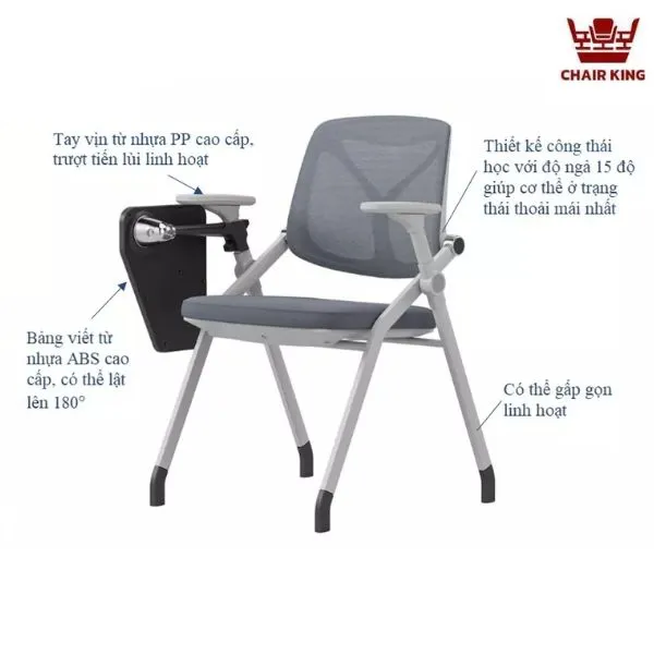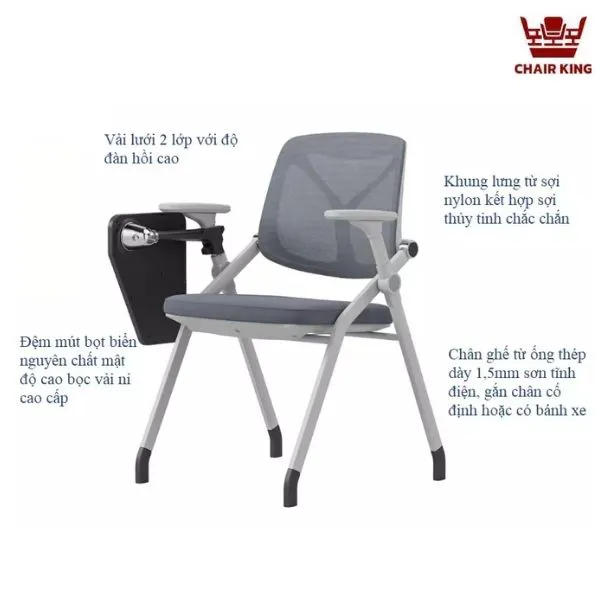 Chất liệu: Khung nhựa PP cao cấp bọc vải lưới 2 lớp đàn hồi, đệm mút bọt biển định hình. Chân thép sơn tĩnh điện. Tay viết từ nhựa ABS cao cấp