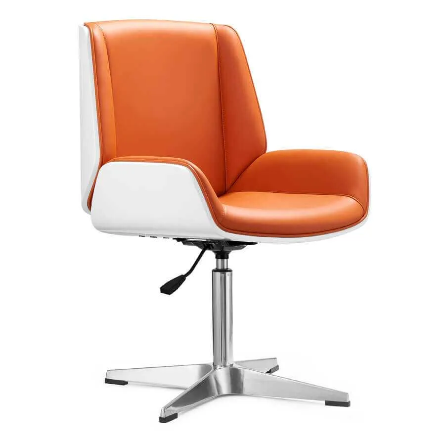 Một trong những ưu điểm nổi bật của Ghế xoay da Babydon B319 nằm ở chất liệu bọc da PU hoặc da thật cao cấp, với tone màu cam sang trọng và dễ phối hợp nội thất. Chất da có bề mặt nhẵn mịn, không thấm nước, dễ dàng vệ sinh, đồng thời mang lại cảm giác mềm mại khi tiếp xúc trực tiếp. Bên trong là lớp mút đúc dày dặn, có độ đàn hồi cao, giúp giữ được phom dáng và không bị lún xẹp theo thời gian. Cấu trúc ghế được cố định chắc chắn trên trục xoay bằng kim loại sáng bóng, vừa tăng độ bền vừa tạo điểm nhấn nổi bật về mặt thẩm mỹ.