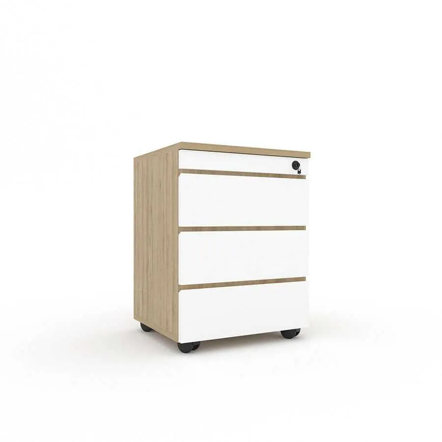 Hộc tủ di động HT02 sở hữu thiết kế đơn giản nhưng không kém phần đẳng cấp, tương thích với mọi phong cách nội thất văn phòng. Sản phẩm được làm từ chất liệu gỗ công nghiệp cao cấp, phủ một lớp Melamine chống trầy xước, chống thấm nước, giúp đỡ duy trì vẻ đẹp lâu dài và dễ dàng vệ sinh. Đây là một ưu điểm quan trọng, đặc biệt trong môi trường văn phòng nơi tủ thường xuyên tiếp xúc với tài liệu, hồ sơ và các vật dụng văn phòng khác.