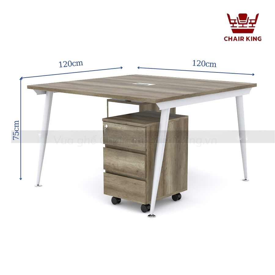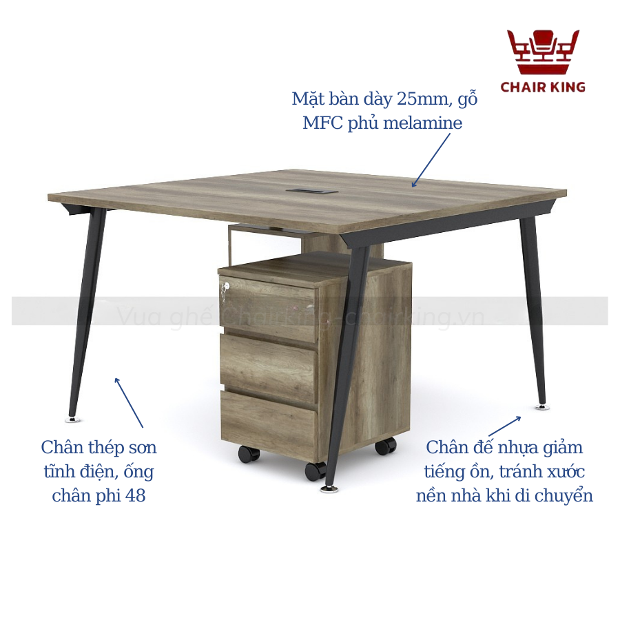 | Đặc điểm | Mặt bàn sử dụng gỗ MFC cao cấp, bề mặt phủ melamine chống thấm, hạn chế trầy xước Khung chân côn bằng thép sơn tĩnh điện, kết cấu chắc chắn, chịu lực tốt Đế chân nhựa cao cấp giúp giảm tiếng ồn khi di chuyển và tránh trầy xước sàn Có thể kết hợp hộc tủ di động để lưu trữ tài liệu, đồ dùng cá nhân |