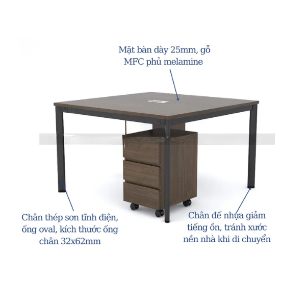 | Đặc điểm | Mặt bàn chắc chắn, bền màu; khung chân Oval Line hiện đại; đế chân nhựa chống trượt – giảm tiếng ồn; có thể kết hợp hộc tủ di động |