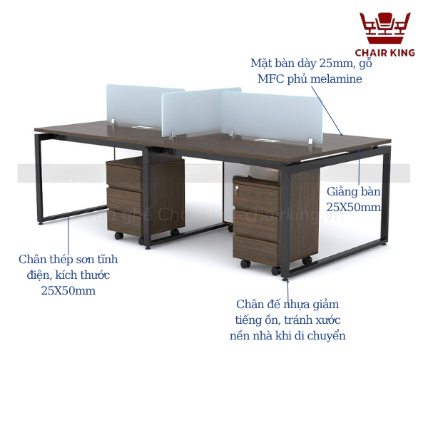 | Đặc điểm | Mặt bàn MFC phủ melamine chống thấm, chống xước. Khung chân thép chắc chắn. Đế chân bằng nhựa hạn chế tiếng ồn và tránh xước nền. Có thể kết hợp hộc tủ di động. |