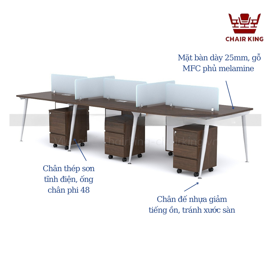 Chất Liệu Gỗ công nghiệp MFC dày 25mm, phủ melamineChân sơn tĩnh điện, ống chân phi 48, giằng bàn 25*50mm