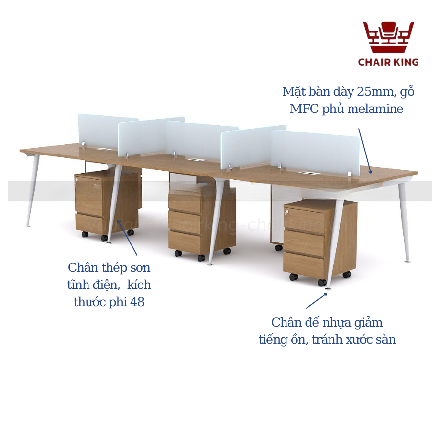| Đặc điểm | Mặt bàn sử dụng gỗ công nghiệp MFC cao cấp, bề mặt phủ melamine chống thấm, tránh xước Khung chân côn, sử dụng thép sơn tĩnh điện, dày 1,1ly, ống chân phi 48, giằng bàn 25x50mm dày dặn, chắc chắn. Đế chân bàn sử dụng nhựa cao cấp, hạn chế tiếng ồn khi di chuyển, tránh làm xước nền nhà. Có thể kết hợp sử dụng hộc tủ di động để bảo quản tài liệu, đồ dùng cá nhân. |