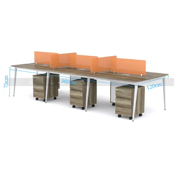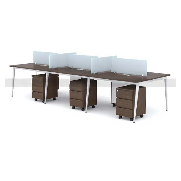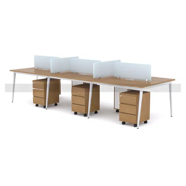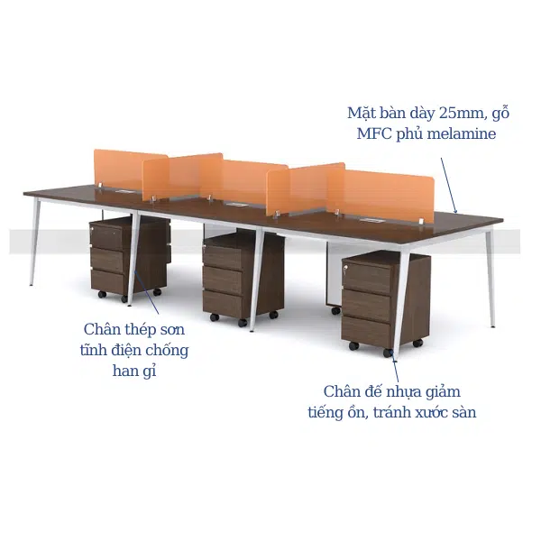 Thiết kế module 6 người giúp tối ưu hóa không gian làm việc, dễ dàng bố trí thành các dãy bàn liền mạch. Kiểu dáng này tạo điều kiện cho nhân viên tương tác, trao đổi công việc hiệu quả mà không chiếm quá nhiều diện tích. Sản phẩm đặc biệt phù hợp với văn phòng mở, các dự án hợp tác nhóm hoặc không gian làm việc sáng tạo.