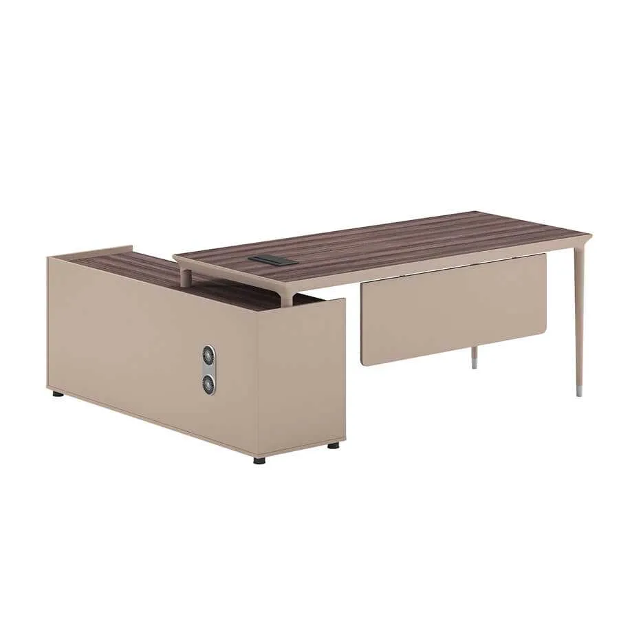 Bàn gỗ Selena SD-31T là mẫu bàn làm việc cao cấp, mang đến sự sang trọng và hiện đại cho không gian văn phòng. Kiểu dáng bàn chữ L giúp tận dụng tối đa diện tích, tạo sự rộng rãi và tiện lợi khi làm việc. Phần mặt bàn được thiết kế vuông vắn, tinh tế, tone màu nâu gỗ tự nhiên ấm áp và sang trọng mang lại vẻ đẹp tối giản nhưng vẫn toát lên sự quyền lực. Thiết kế này không chỉ giúp không gian làm việc trở nên chuyên nghiệp mà còn giúp người sử dụng cảm thấy thoải mái và tập trung hơn.