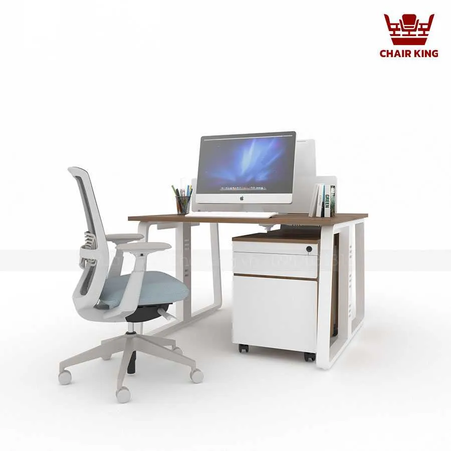 Khung sắt hộp sơn tĩnh điện cao cấp, uốn cong thành hình thang, giảm đi sự khô khan của văn phòng. Ngoài ra còn thiết kế thêm trục nhằm giữ thăng bằng và chịu lực tốt. Đế bàn được làm bằng thép bo tròn giúp giữ bàn không xê dịch và cân bằng hơn.