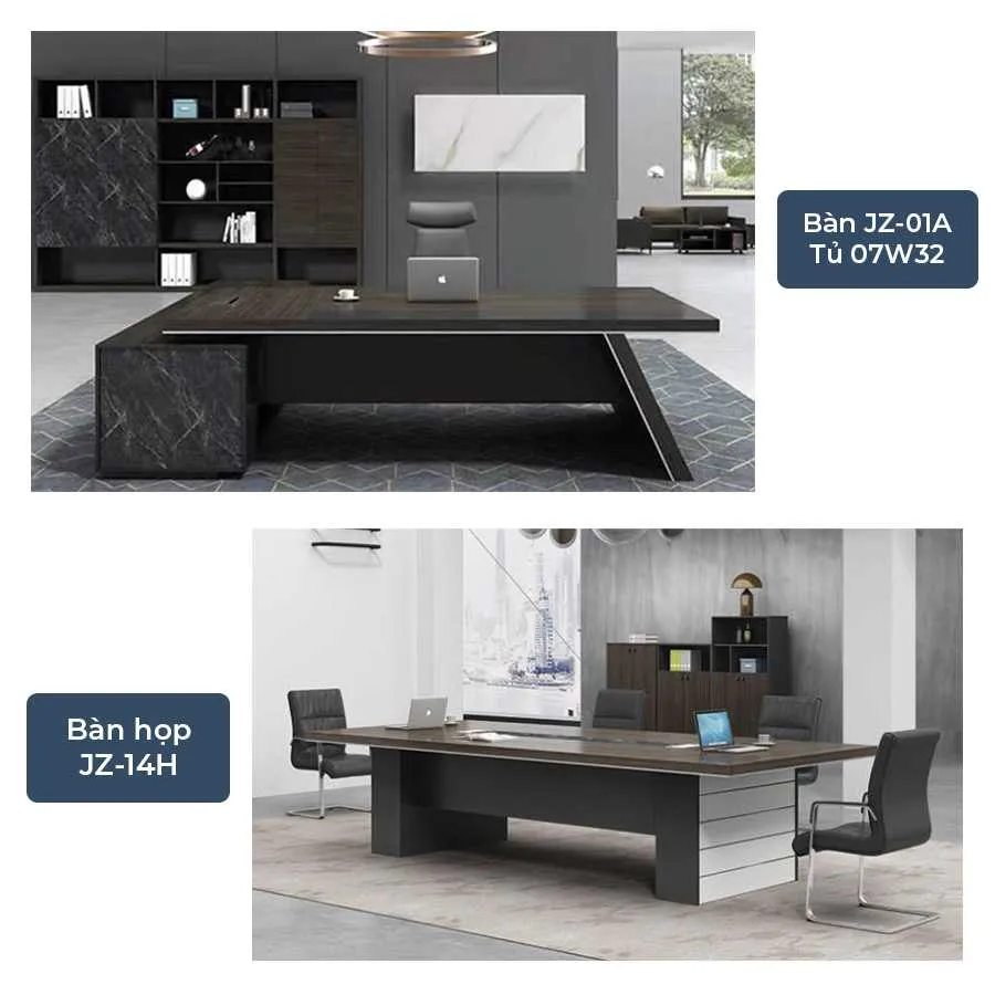 – Tủ lãnh đạo Eury 07W32: 2800*400*2000mm (Dài*Sâu*Cao) – Bàn họp cao cấp Eury JZ-14H: 2400*1200*750mm (Dài*Rộng*Cao) |