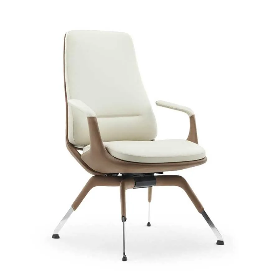 Ghế da Theros 1806C có kiểu dáng tay vịn và chân ghế hoàn toàn khác biệt so với các mẫu ghế thông thường. Tông màu nâu da bò kết hợp kem sữa giúp văn phòng trở nên thời thượng hơn bao giờ hết. Nếu bạn đang tìm kiếm một điểm nhấn độc đáo cho văn phòng của mình thì mẫu ghế này chính là sản phẩm không nên bỏ qua. Lớp da bọc bên ngoài có độ mềm mại cao, tạo cảm giác êm ái khi tiếp xúc, đồng thời mang lại sự sang trọng cho không gian làm việc. Các đường may trên bề mặt ghế được thực hiện một cách tỉ mỉ, giúp tăng tính thẩm mỹ cũng như độ bền cho sản phẩm. Không chỉ vậy, phần tay vịn được thiết kế uốn cong mềm mại, bên ngoài bọc da giúp tạo cảm giác thoải mái khi đặt tay trong quá trình làm việc.