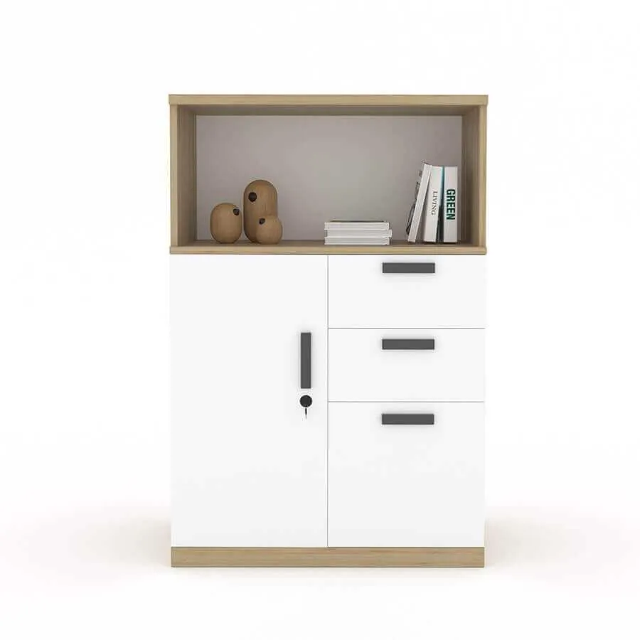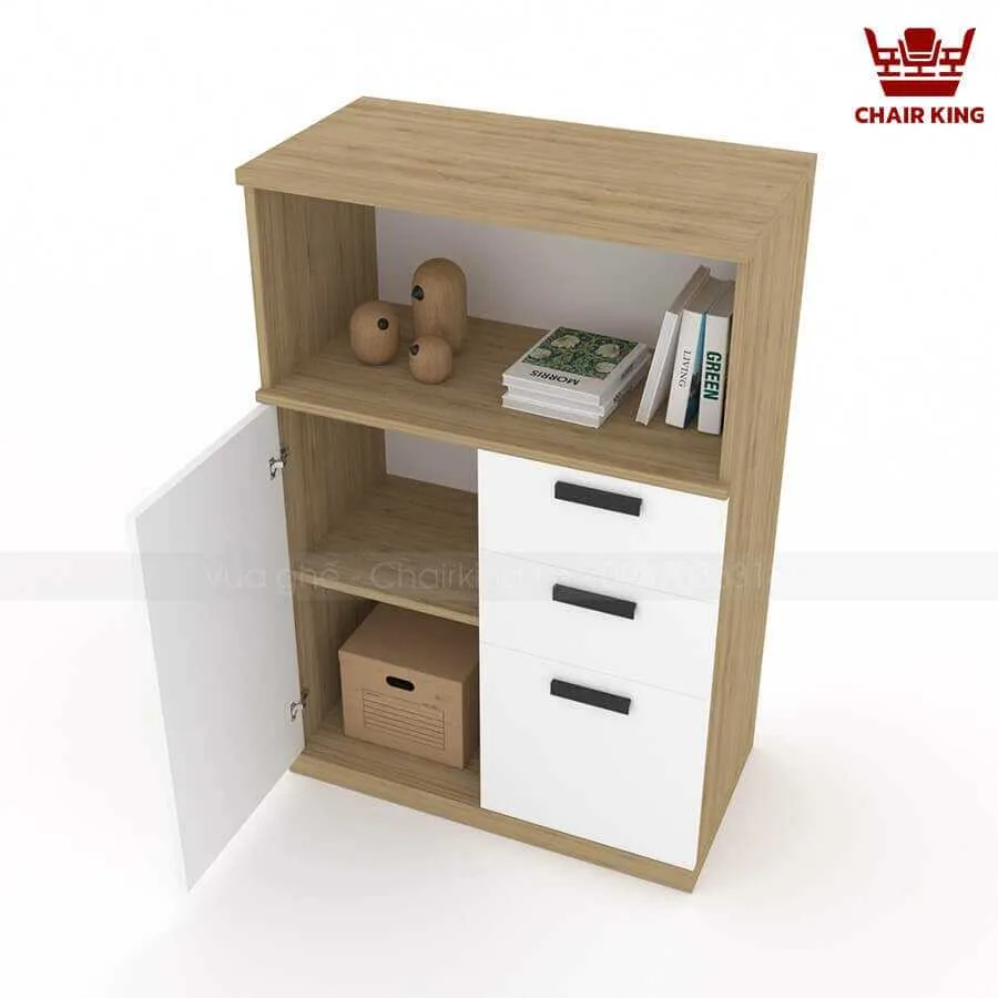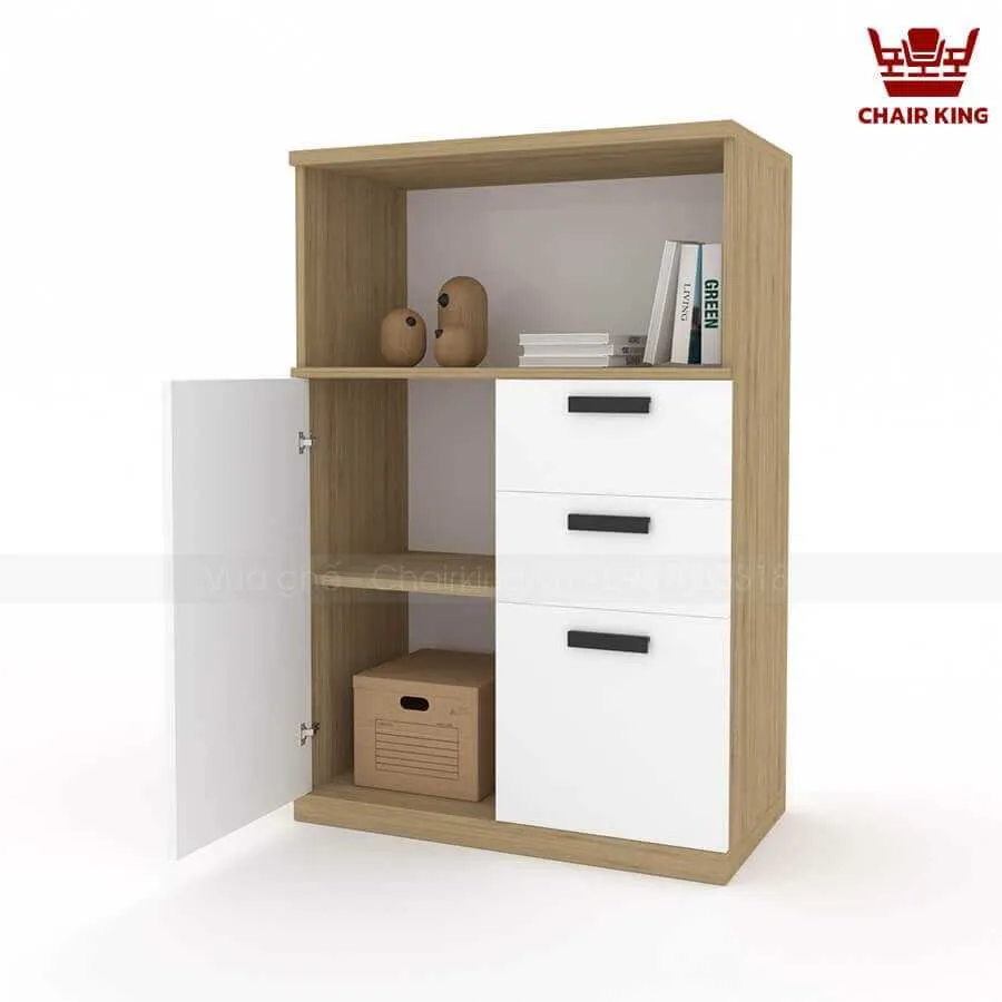 | Kiểu dáng | Tủ kiểu dáng hiện đại, đơn giản. Phía trên tủ được chia thành 1 ngăn mở, thuận tiện cho việc để đồ trang trí và tài liệu. Phía dưới tủ có 1 cánh kín và 3 ngăn kéo có tay nắm cửa tiện dụng và khóa tủ để nâng cao tính bảo mật. |