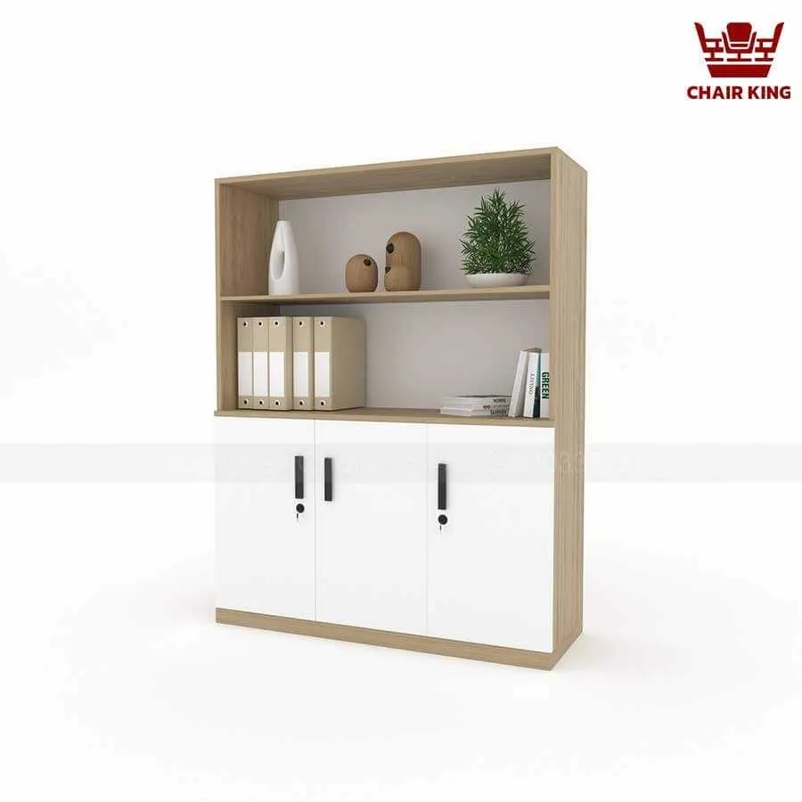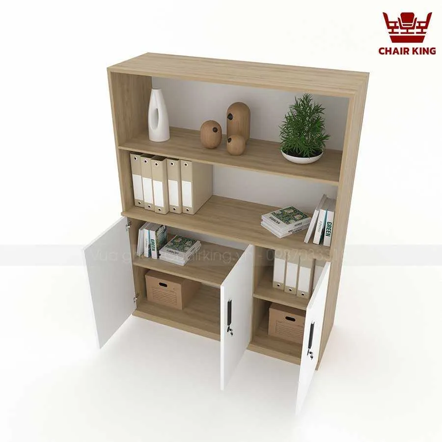 Phía trên tủ được chia thành 2 ngăn mở, thuận tiện cho việc để đồ trang trí và tài liệu. Phía dưới tủ có 3 cánh kín, có tay nắm cửa tiện dụng và khóa tủ để nâng cao tính bảo mật.