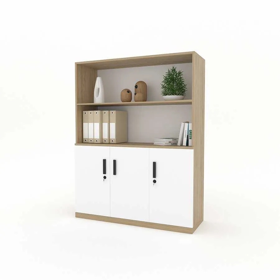 Phần trên của tủ gồm các kệ mở, giúp người dùng dễ dàng truy cập các tài liệu thường xuyên sử dụng, đồng thời có thể tận dụng để trang trí. Điều này không những tăng thêm tính thẩm mỹ mà còn giúp không gian văn phòng trở nên sinh động, sáng tạo hơn.