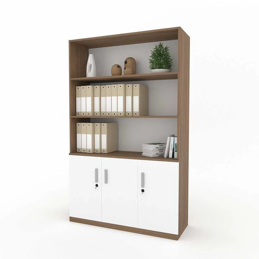 Phần dưới của tủ là các ngăn có cánh đóng, tích hợp khóa an toàn, thích hợp để lưu trữ các tài liệu quan trọng hoặc những vật dụng cá nhân cần được bảo mật. Hệ thống cửa tủ được thiết kế chắc chắn, giúp bảo vệ tài liệu khỏi bụi bẩn, côn trùng và những tác động từ môi trường bên ngoài.